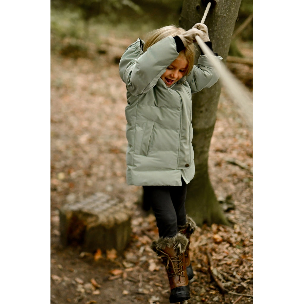 - Vindtæt og isolerende med let og fyldig polyesterfyld, der holder barnet varmt og beskyttet mod vinden.