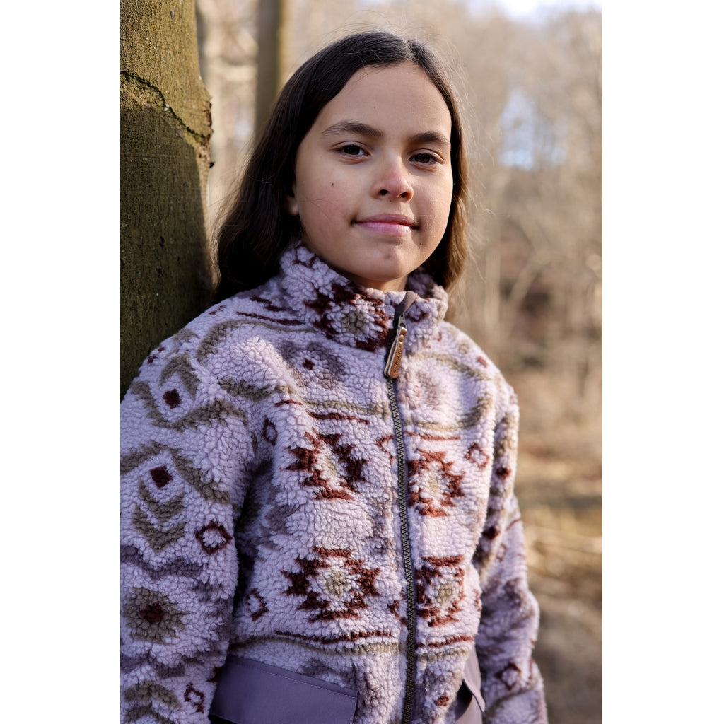 Mikk-lines teddyjakke er en dejlig plysset jakke med et mønstret design. Den er en fantastisk blød og nuttet jakke, der vil omfavne og varme børn på de kølige efterårsdage.