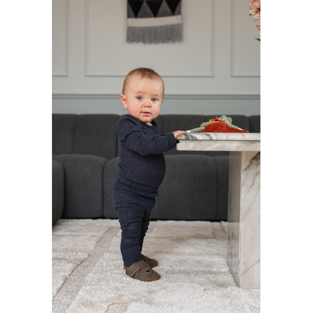 Ensfarvet langærmet uld/bambus baby bluse fra mikk-line. Det er en blød, strækbar og holdbar top, der er perfekt til det lille barns hverdagsgarderobe. Blusen er lavet af en blanding af de naturlige materialer uld og bambus, tilsat spandex for stræk, så den giver barnet en høj komfort og bevægelsesfrihed. Kvaliteten er samtidig med til at sikre barnet en stabil kropstemperatur, og den er særligt velegnet til sensitiv hud.