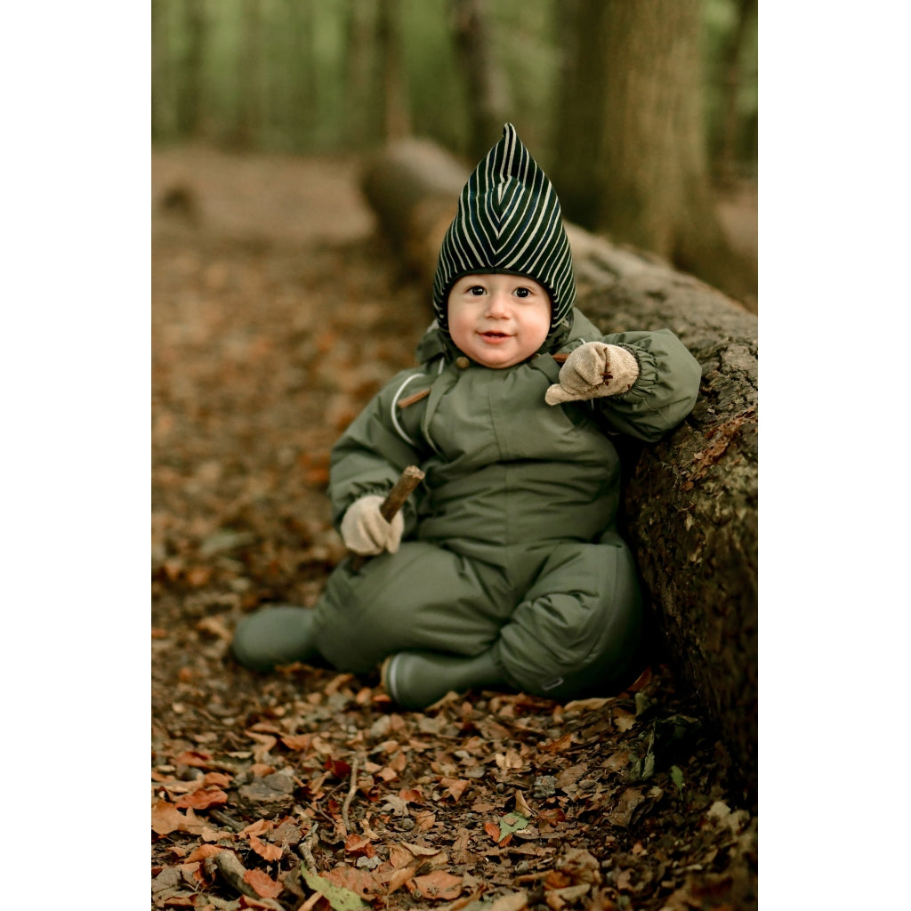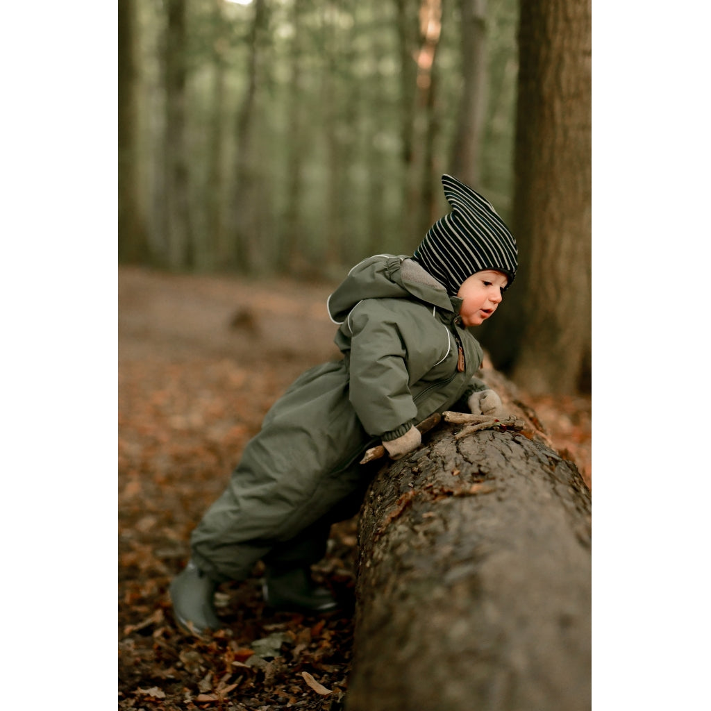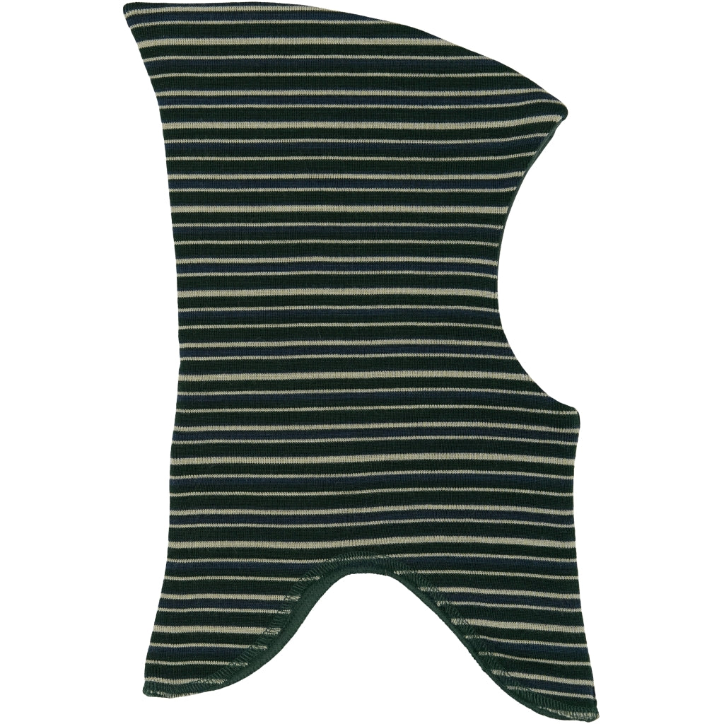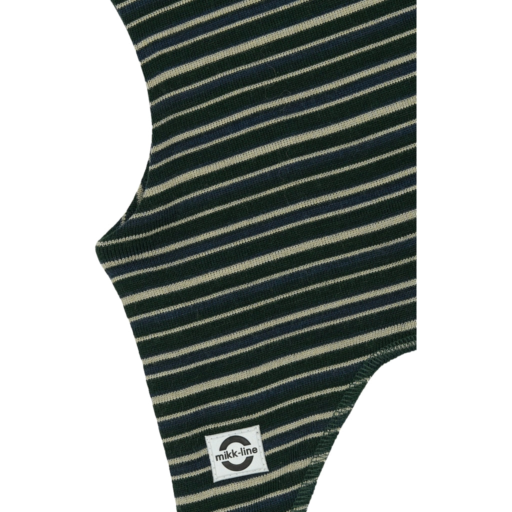 Mikk-line elefanthue med garnfarvede striber i tre farver og vindstop ved ørerne. Elefanthuen er lavet af bomuld på indersiden og en blanding af merinould og akryl på ydersiden. Denne lækre vinterhue dækker det meste af barnets hoved, hals og ansigt, så den beskytter barnet mod kulde og vind, når det leger og udforsker naturen under den åbne himmel. Huen fås i dobbeltstørrelser fra 74/80 til 134/140 cm (ca. 9 måneder til 10 år).