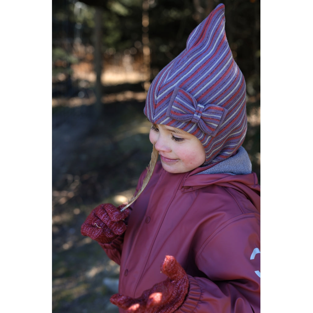 Mikk-line elefanthue med garnfarvede striber i tre farver, vindstop ved ørerne og en lille blomsterdetalje. Elefanthuen er lavet af bomuld på indersiden og en blanding af merinould og akryl på ydersiden. Denne lækre vinterhue dækker det meste af barnets hoved, hals og ansigt, så den beskytter barnet mod kulde og vind, når det leger og udforsker naturen under den åbne himmel. Huen fås i dobbeltstørrelser fra 74/80 til 134/140 cm (ca. 9 måneder til 10 år).