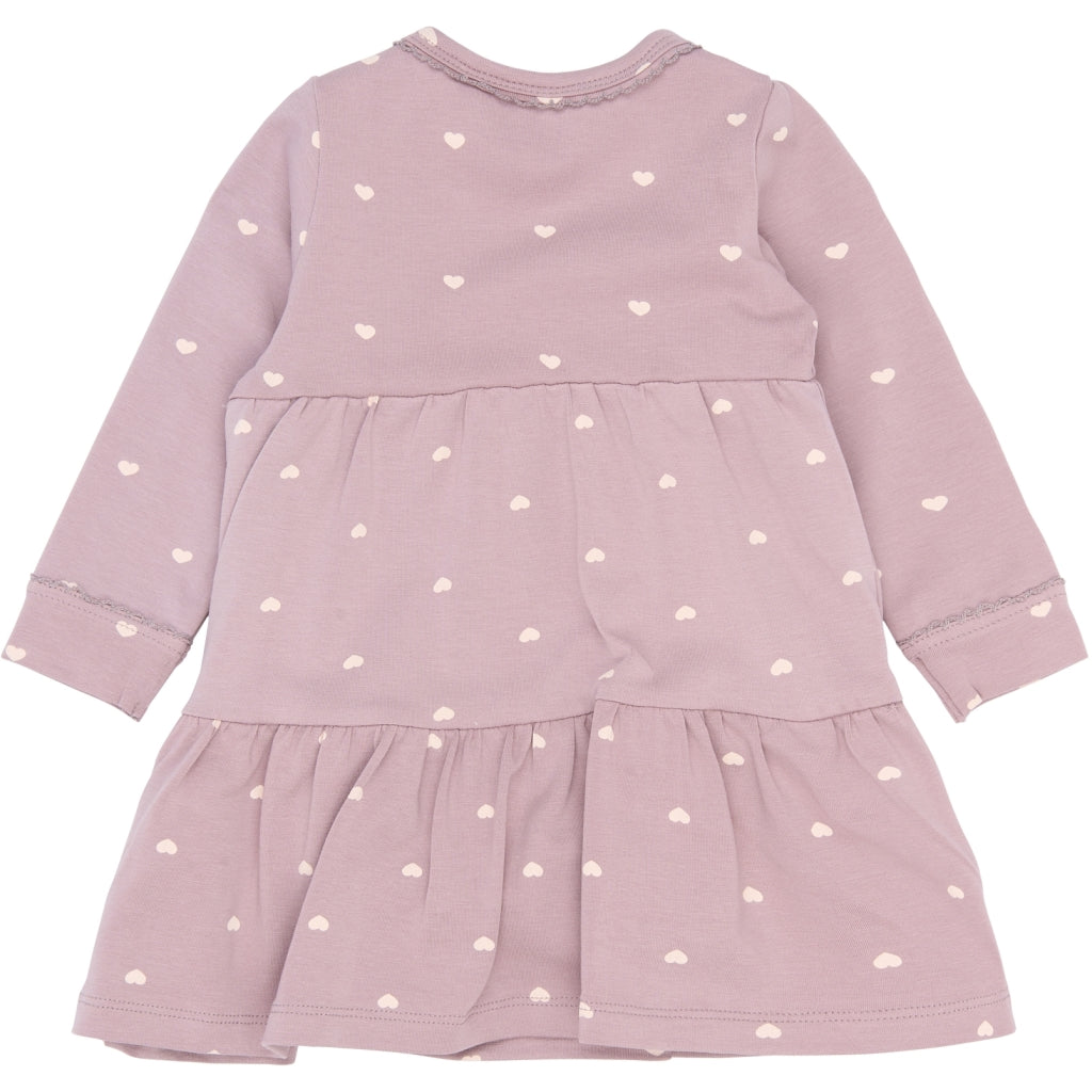 Denne langærmede kjole til baby pige er lavet i en strækbar bomuldsblanding for en behagelig pasform til hverdagen. Modellen har rund hals med trykknapper på den ene skulder, som gør påklædningen enkel. Hals- og ærmekanter er afsluttet med picotkant for et pænt udtryk. Kjolen har allover hjerteprint og et rynket, todelt skørt, der giver et let fald. Nem at kombinere med strømpebukser eller leggings og fungerer godt i lag med en body eller cardigan.