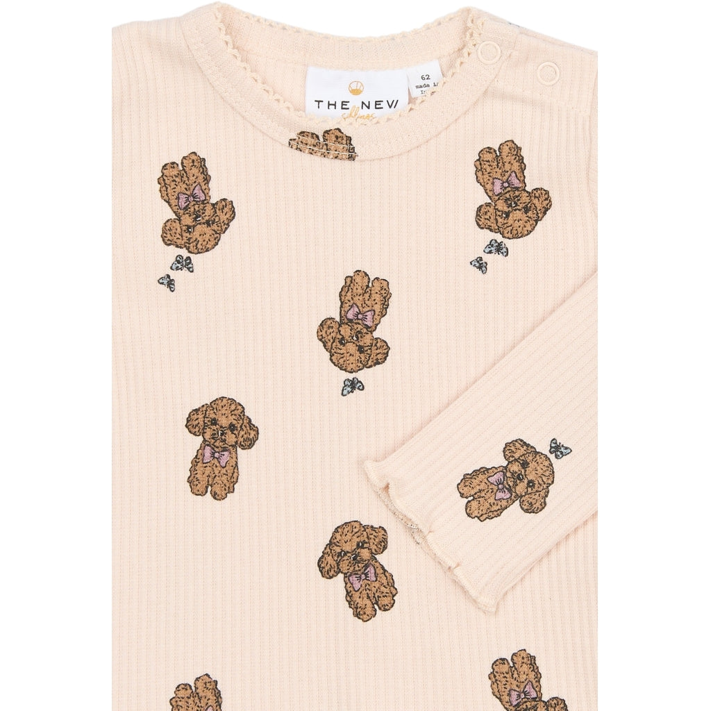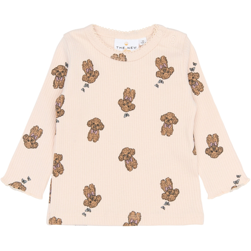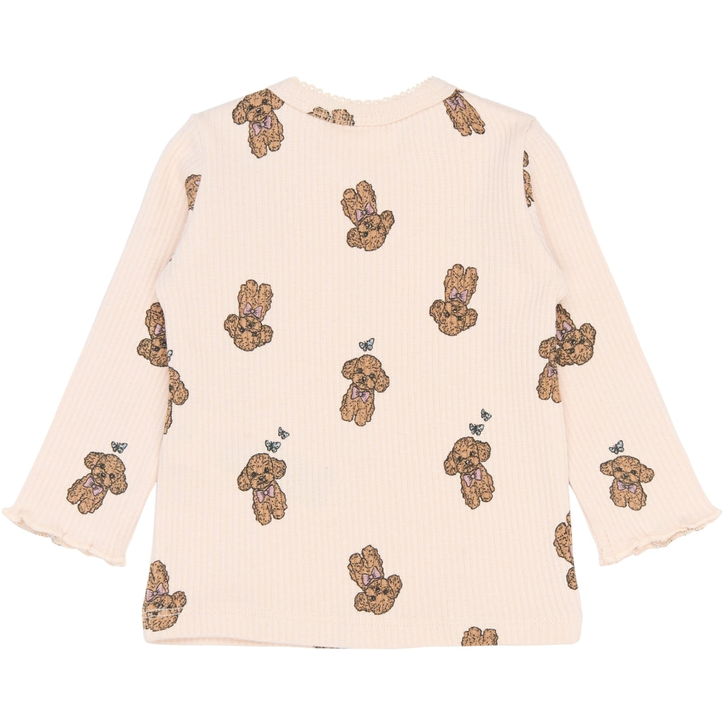 Langærmet rib T-shirt til baby med rund hals og trykknapper på skulderen, som gør påklædning enkel. Kvaliteten er en blanding af bomuld og elastan, der giver en fleksibel pasform med stræk. Overfladen har tydelig ribstruktur og et gennemgående print med bamser og små sløjfer. Ærmekanterne er let bølgede, og den lige bund gør den nem at style. Velegnet alene eller som lag under cardigans, kjoler eller overalls.