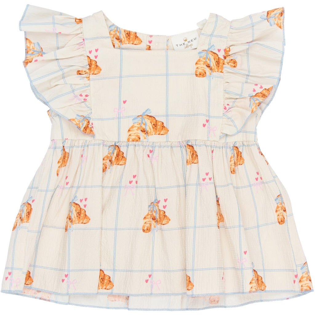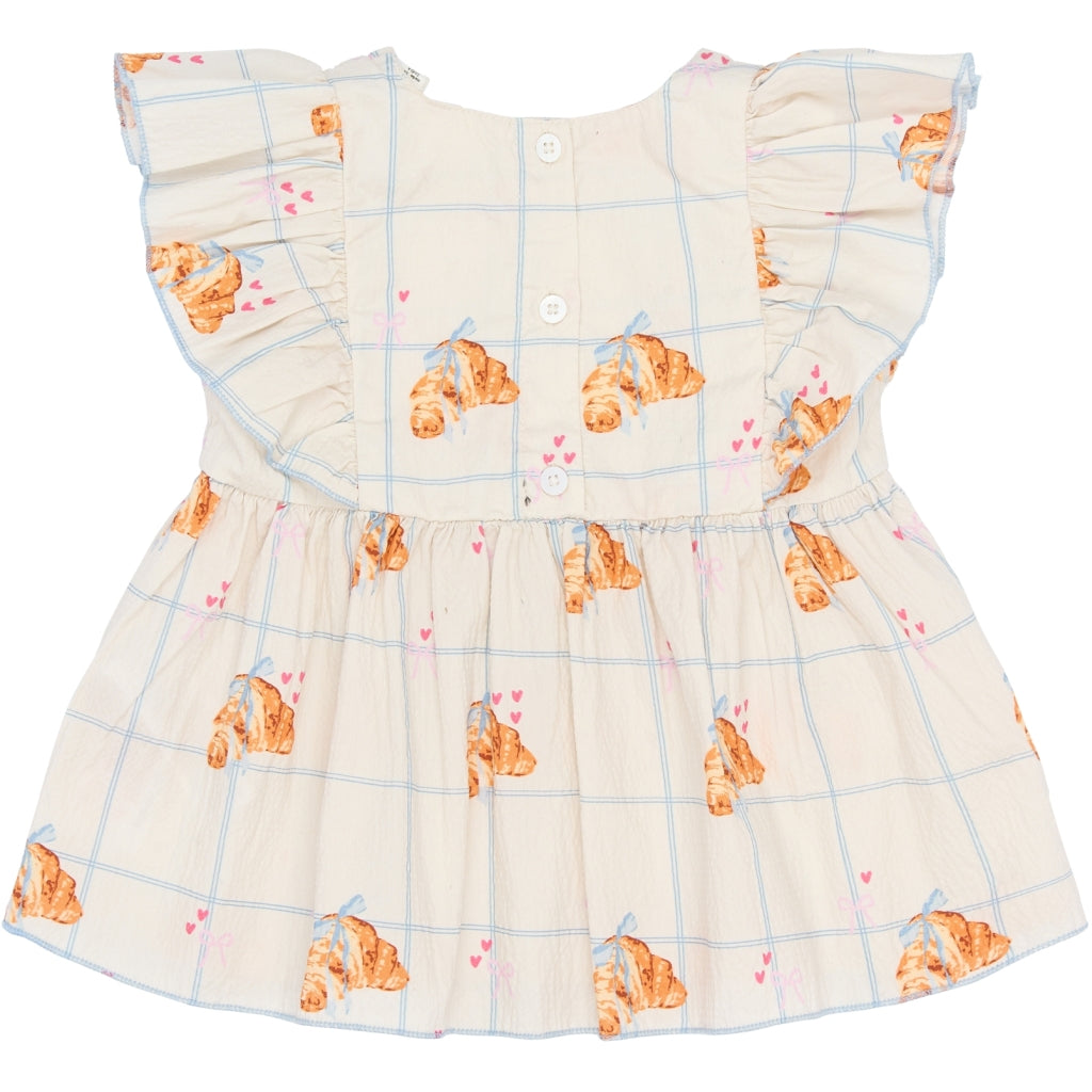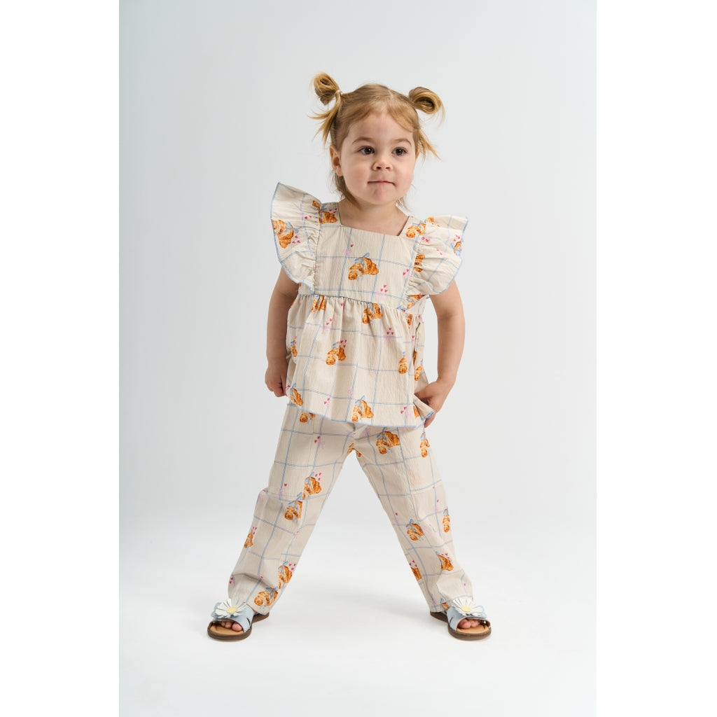 En sød og sommerlig top til de mindste, designet med fine flæser ved skuldrene og en let, svajende pasform, der giver masser af bevægelsesfrihed. Det ternede mønster kombineret med små croissanter og hjerter giver et legende og charmerende udtryk, som passer til både hverdag og små festlige lejligheder. Kvaliteten er 97% bomuld og 3% elastan, som føles blød mod huden og giver fleksibilitet hele dagen. Den rynkede talje skaber et pænt fald og et behageligt fit, som er nemt at trække over hovedet. Style den med shorts, leggings eller en lille nederdel for et komplet og sødt look.