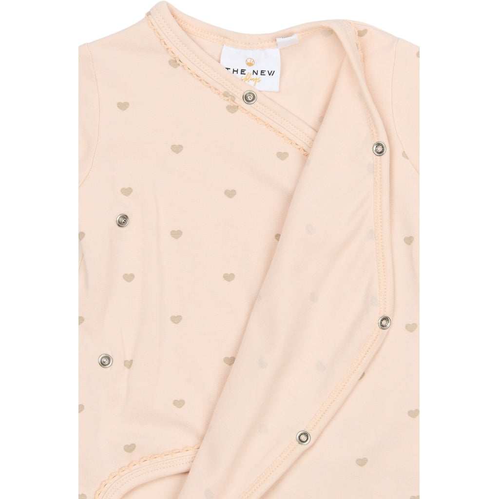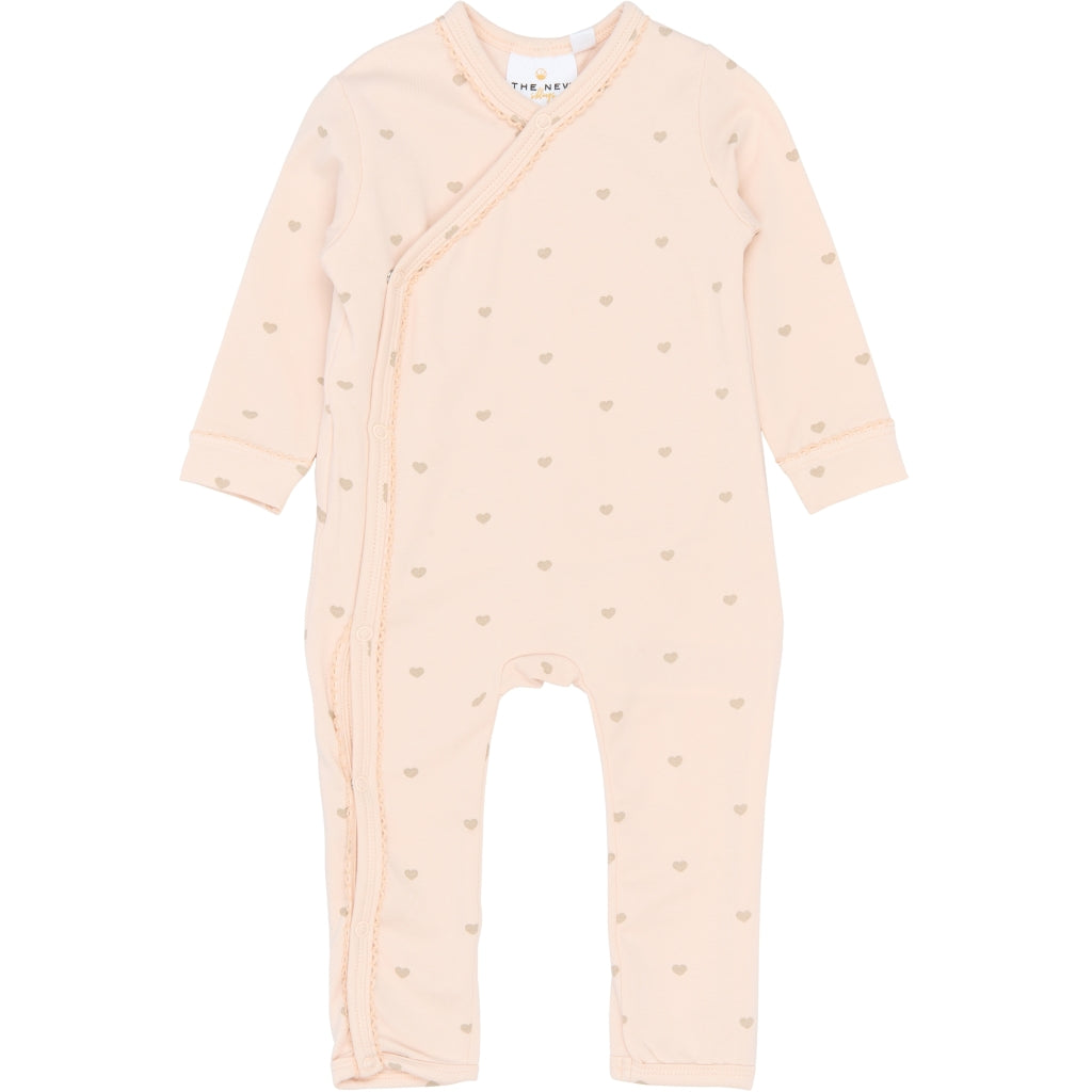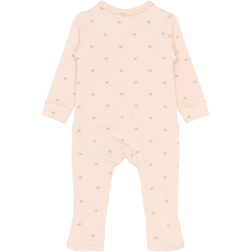 This baby girl jumpsuit features a wrap-over front with snap closures that run from the neckline down one leg for straightforward dressing. It has long sleeves and full-length, footless legs for comfortable coverage. The fabric is a soft blend of 95% cotton and 5% elastane, allowing gentle stretch for movement. An allover small heart print and subtle scalloped edging along the wrap and cuffs add a neat detail. Works well for layering under outer layers or wearing on its own for everyday use.