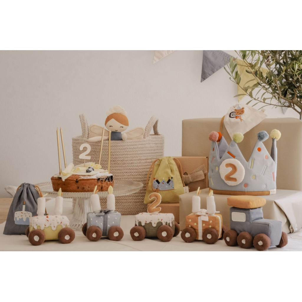 Birthday Train – Blue Mix fra Fabelab gør fødselsdagsbordet ekstra festligt. I rolige blå nuancer kommer det fine trætog med glade figurer, lysholder og tal fra 1-9.