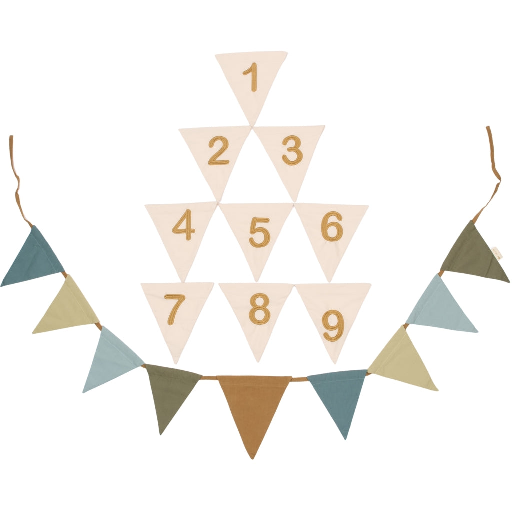 Garland – Celebration Blue Mix fra Fabelab er en festlig stofguirlande i bløde blå, grønne og cremefarvede nuancer. Den består af otte flag og leveres med et udskifteligt talflag (1–9), så den kan tilpasses hver fødselsdag – år efter år.