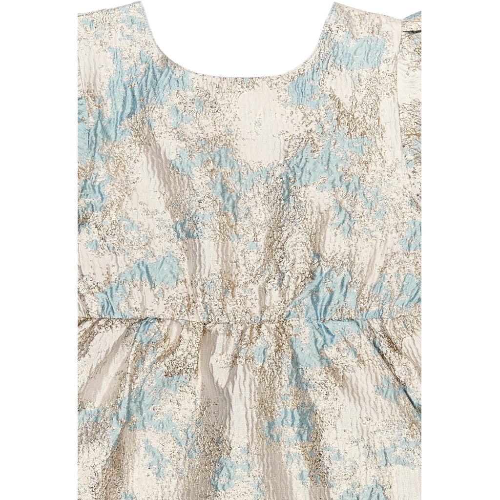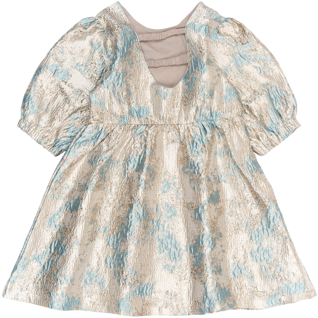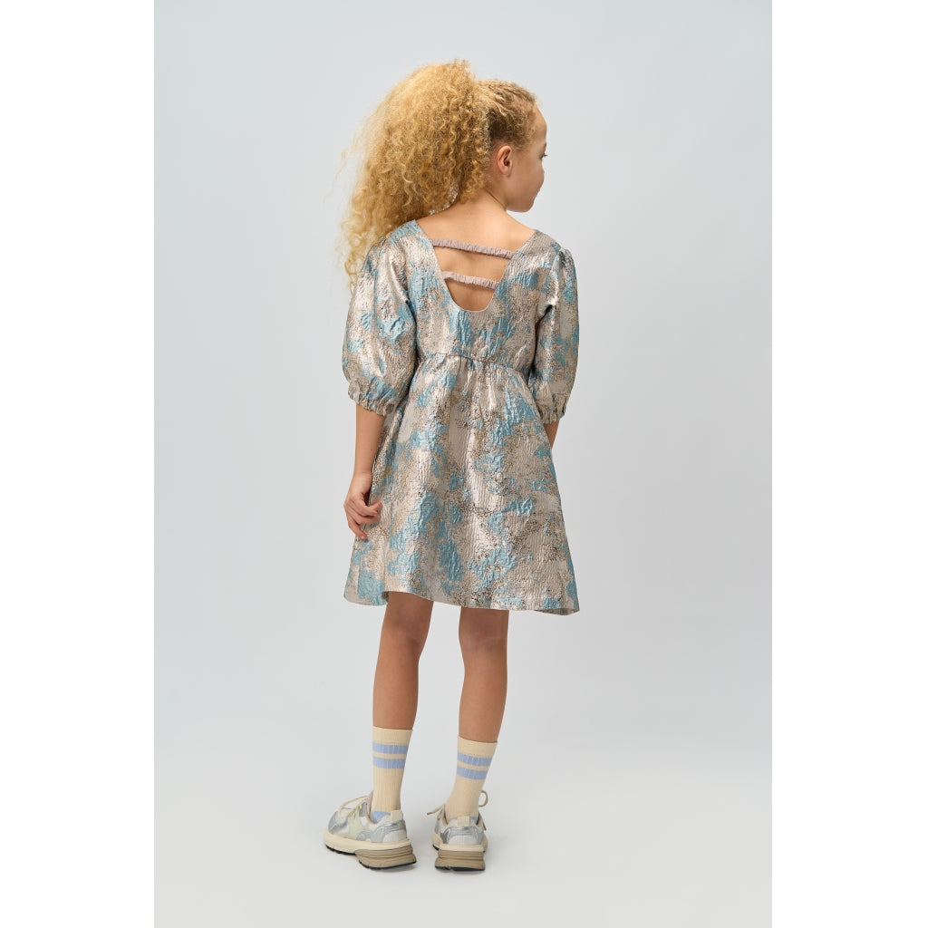 En smuk og elegant kjole fra THE NEW med et eksklusivt brokademønster i gyldne og blå nuancer. Kjolen har en let A-formet silhuet, der skaber en fin og luftig bevægelse. De korte pufærmer og den elastiske talje tilføjer et feminint touch og en behagelig pasform. Som en ekstra detalje har kjolen en lille åbning på ryggen med elastik, der giver et stilfuldt og moderne udtryk.