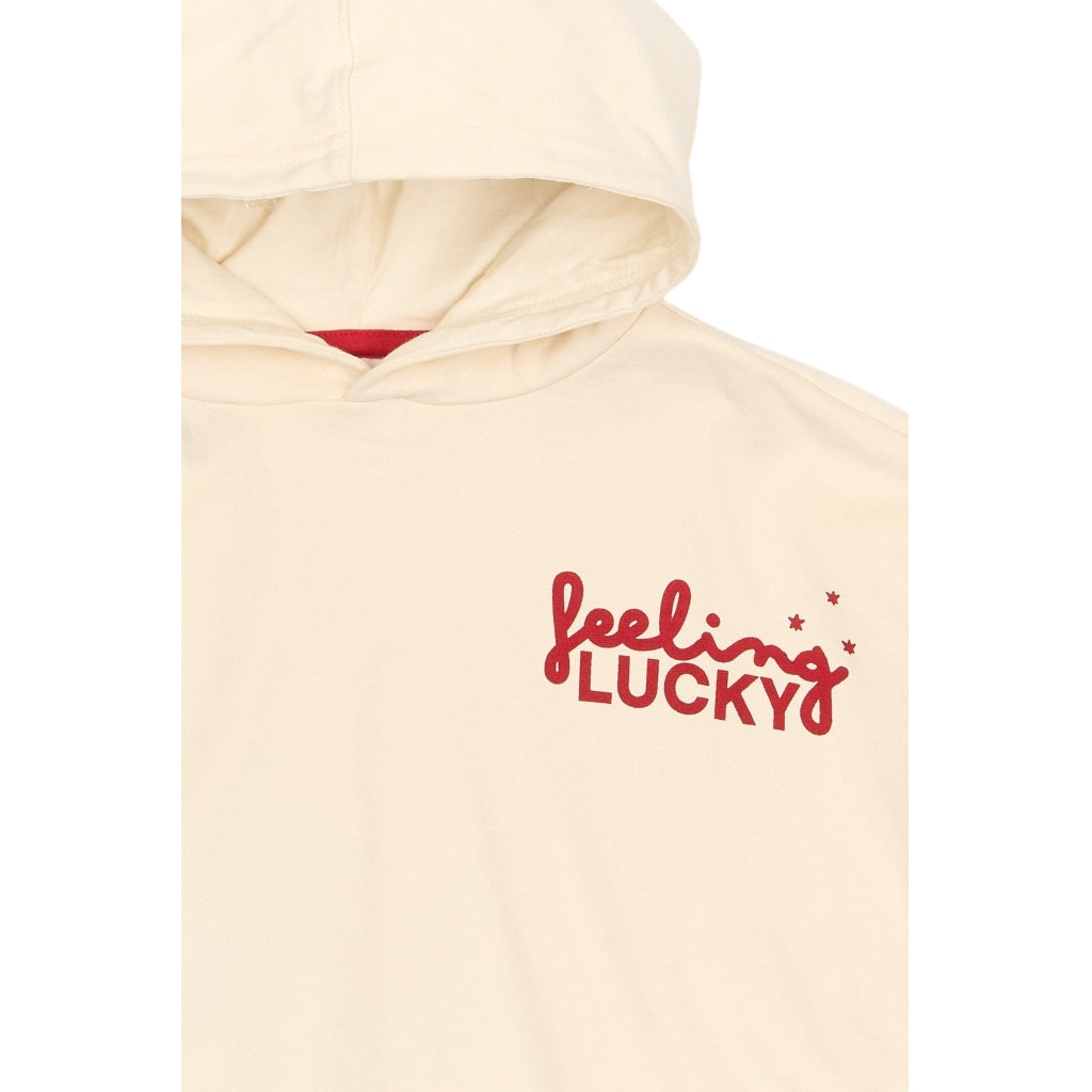 Denne oversize hoodie fra THE NEW tilføjer både komfort og et energisk, glamourøst touch til din garderobe. På fronten finder du den iøjnefaldende tekst "Feeling Lucky" i en sammenhængende skrift, som tilføjer et subtilt glamourøst præg. På ryggen prydes hoodien af samme tekst, akkompagneret af terninger, kort med hjerter og stjerner, hvilket giver et legende og energisk udtryk. Denne hoodie er tilgængelig i to farver og giver et moderne og afslappet look, perfekt til både hverdag og fest.