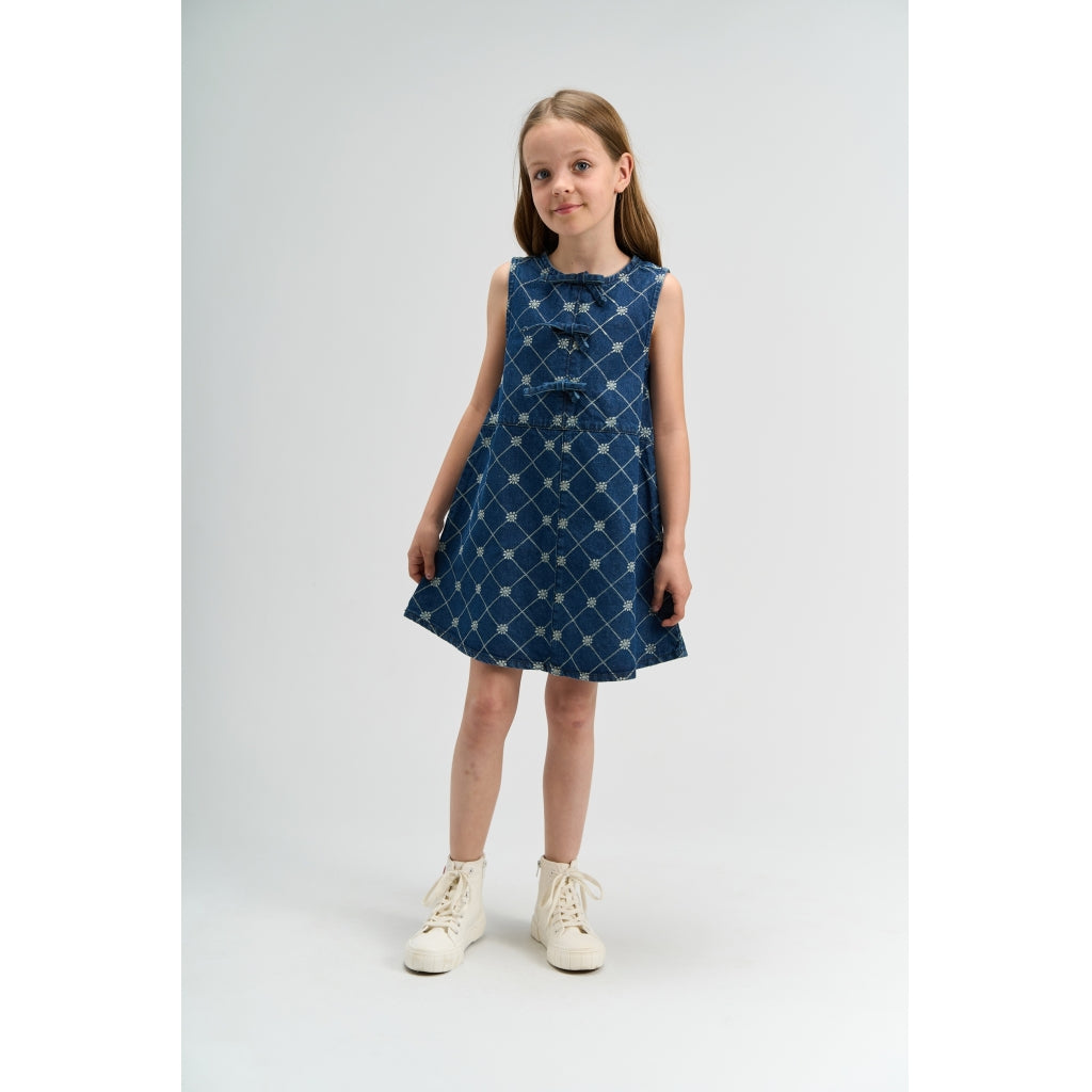 En fin denimkjole til piger, der forener hverdagens komfort med et legende udtryk. Kjolen er ærmeløs med rund hals og har en let A-form, som giver god bevægelsesfrihed til leg og aktivitet. Foran prydes den af små sløjfer og et flot rudemønster med diskrete blomster, der giver et sødt og moderne look. Materialet er 100% bomuld, som føles blødt mod huden og er let at bruge sæson efter sæson. En alsidig favorit, der kan styles med T-shirt under eller cardigan over alt efter vejr og anledning.