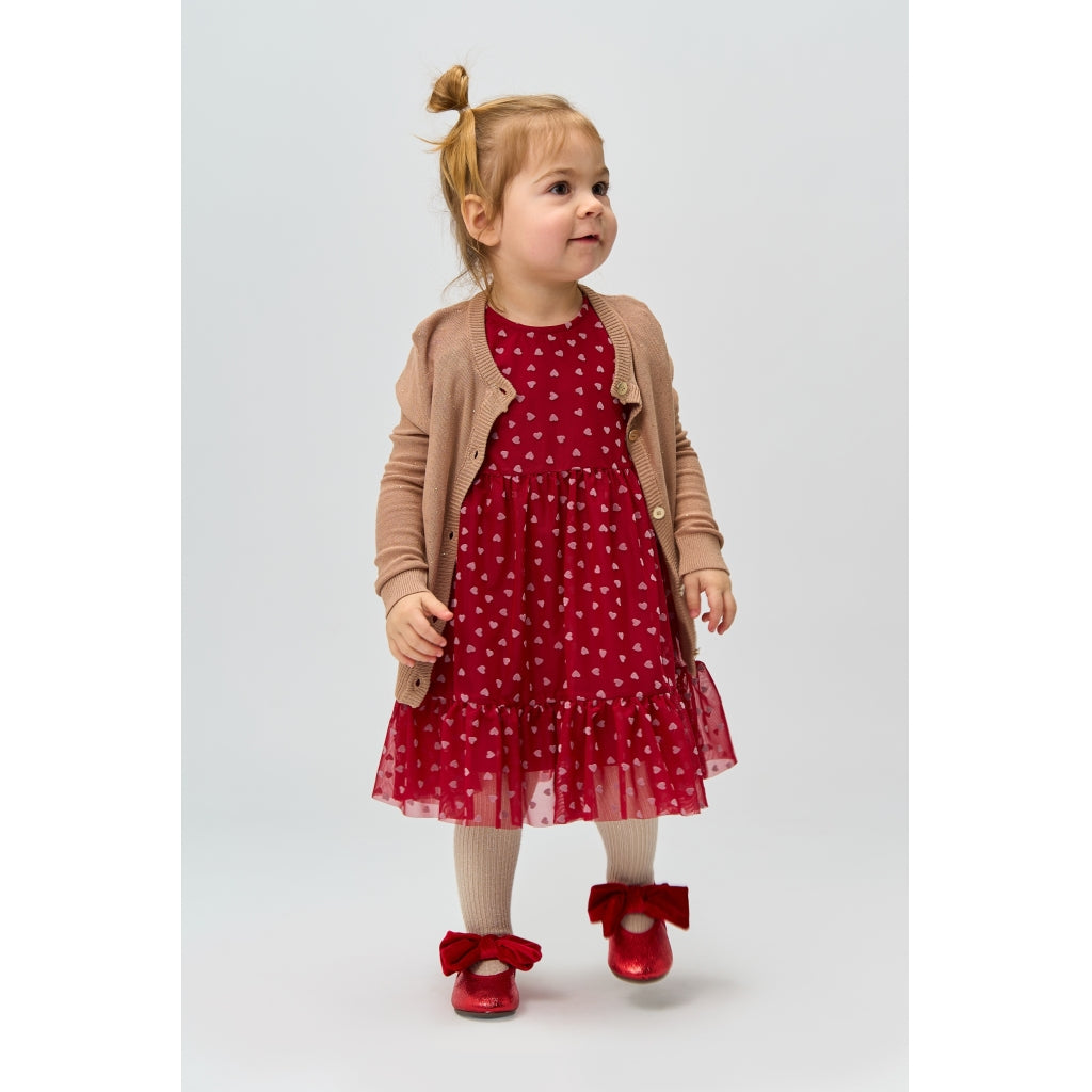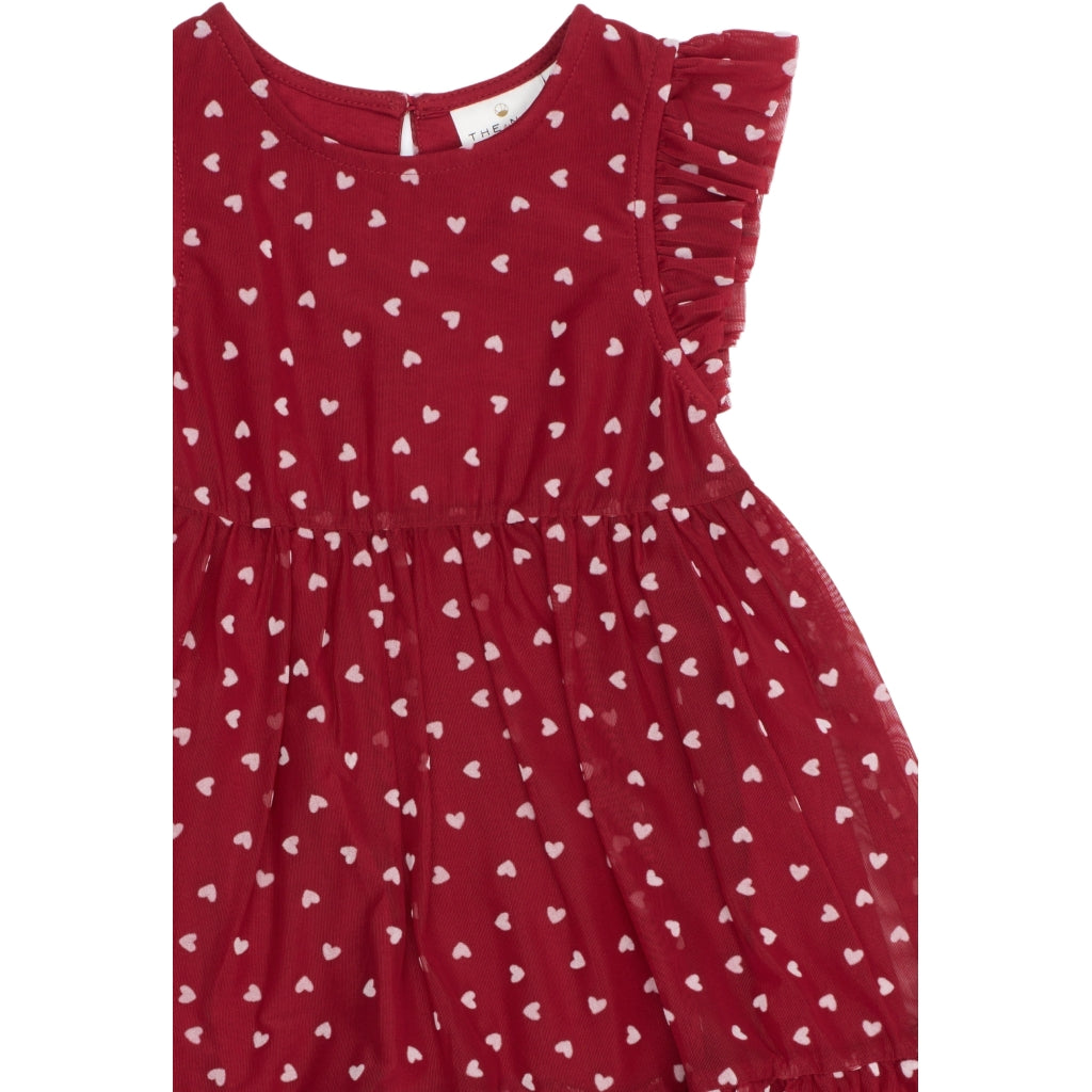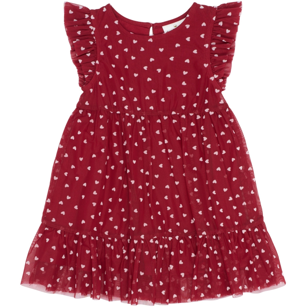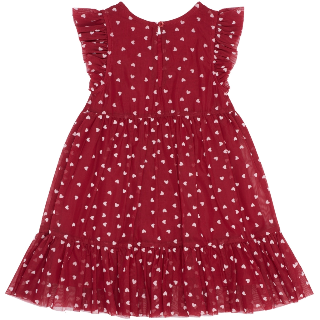 Denne kjole fra THE NEW Siblings er perfekt til festlige lejligheder med sit romantiske og legende design. Den er lavet i lag-på-lag tyl med et fint all-over hjerteprint og har søde flæsedetaljer ved ærmer og nederste kant. Det lette materiale og det vidde skørt giver smuk bevægelse og en drømmende silhuet – ideel til både leg, fest og særlige øjeblikke.