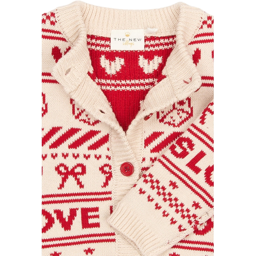 Denne cardigan fra THE NEW Siblings er både hyggelig og festlig – perfekt til sæsonens mange varme og kærlige øjeblikke. Den er strikket med et charmerende jacquardmønster med hjerter, sløjfer, terninger og teksten “LOVE”, der skaber et legende og kærligt udtryk. Cardiganen har ribkanter og knaplukning foran, som gør den nem at tage af og på.