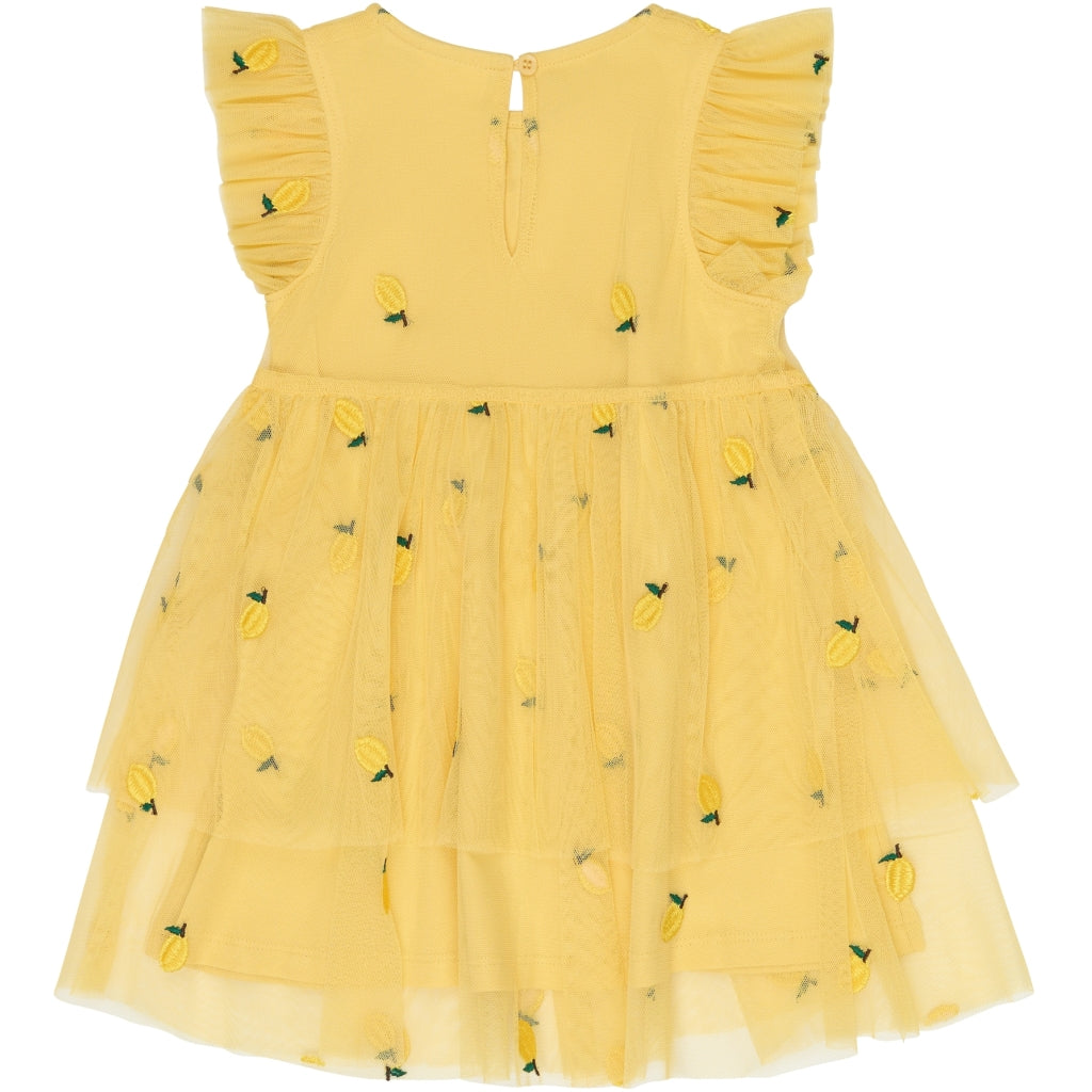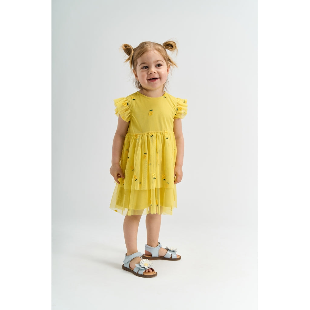 TNSTSvea S_L Dress er en solgul kjole til tumlingepiger, der stråler af sommerglæde. Kjolen har et legende udtryk med små citronbroderier og et let, svajende skørt i flere lag, der indbyder til snurreture. De fine flæseærmer og den runde hals giver et sødt og klassisk look, mens den lille knaplukning i nakken gør den nem at få af og på. Yderstof i 100% polyester giver et flot fald, og blødt foer i 100% bomuld sikrer god komfort mod den sarte hud. Perfekt til både fødselsdage, ferier og hverdagsglæder.