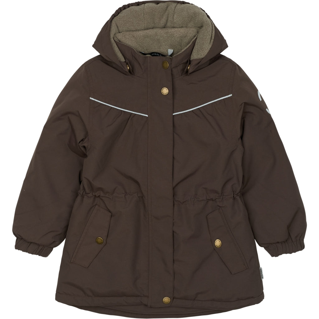 Ensfarvet mikk-line vinterjakke til piger, der elsker leg og eventyr i naturen og under åben himmel. Det er en holdbar nylon vinterjakke af høj kvalitet og enkelt design, der holder barnet varmt og komfortabelt i det kolde efterårs- og vintervejr med vind, regn og sne.