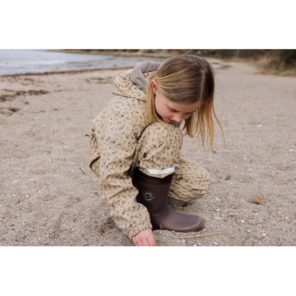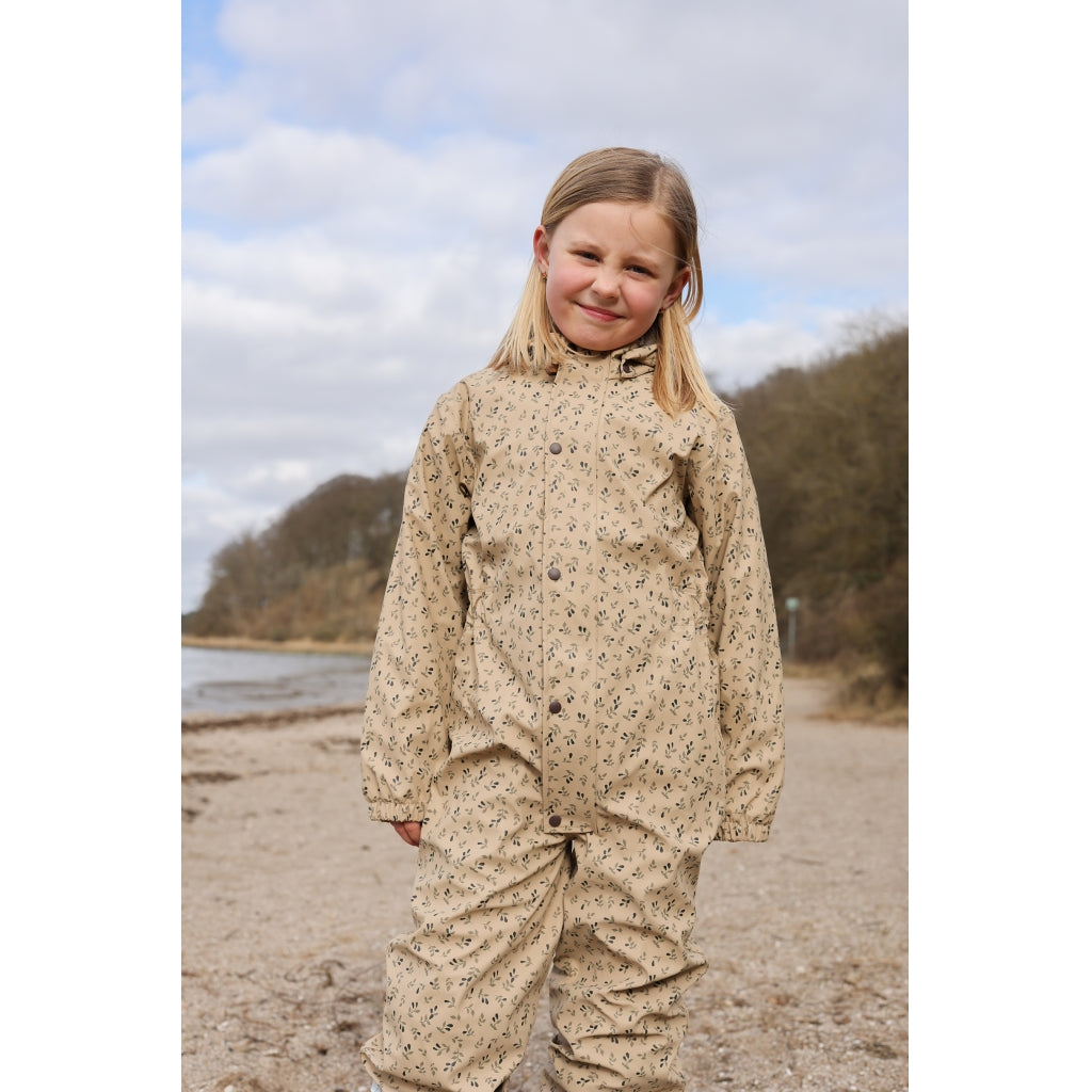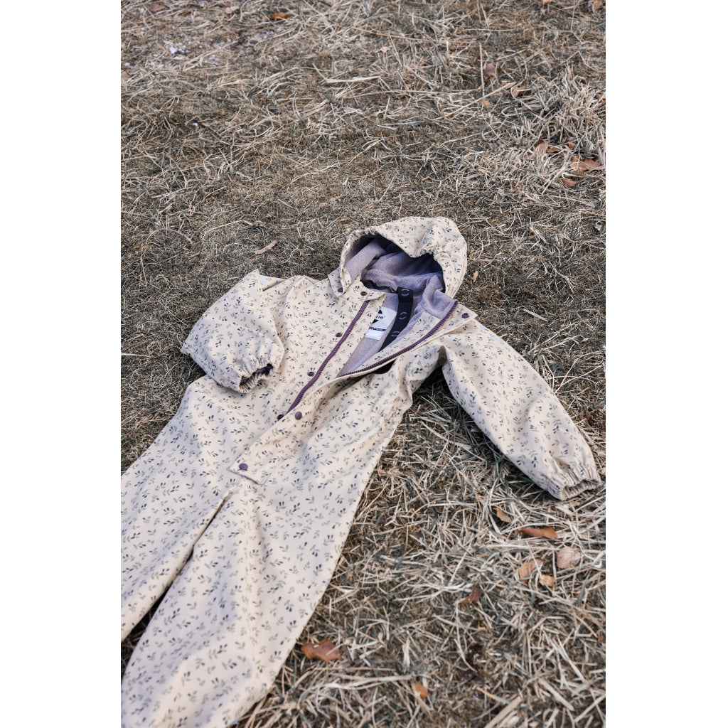 - Vindtæt og isolerende med en blød og plysset fleece foring i midten jakken og den øverste del af bukserne. Ærmerne og det resterende af buksebenene har en glat overflade for at undgå friktion og gøre det lettere at få barnet i regntøjet.