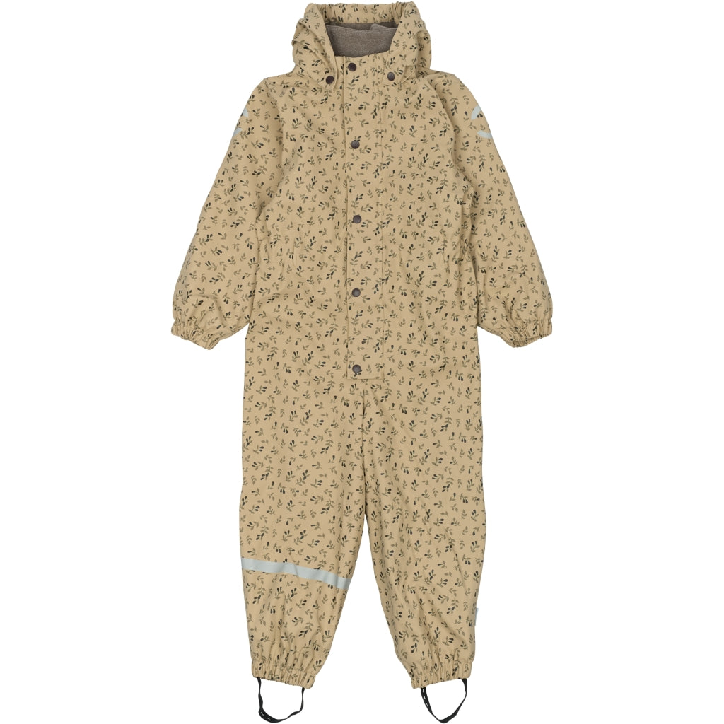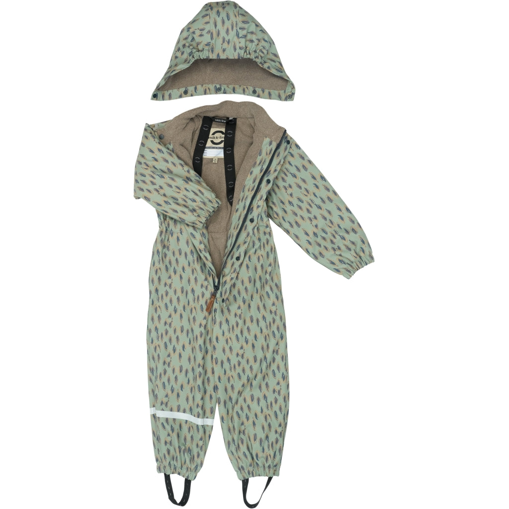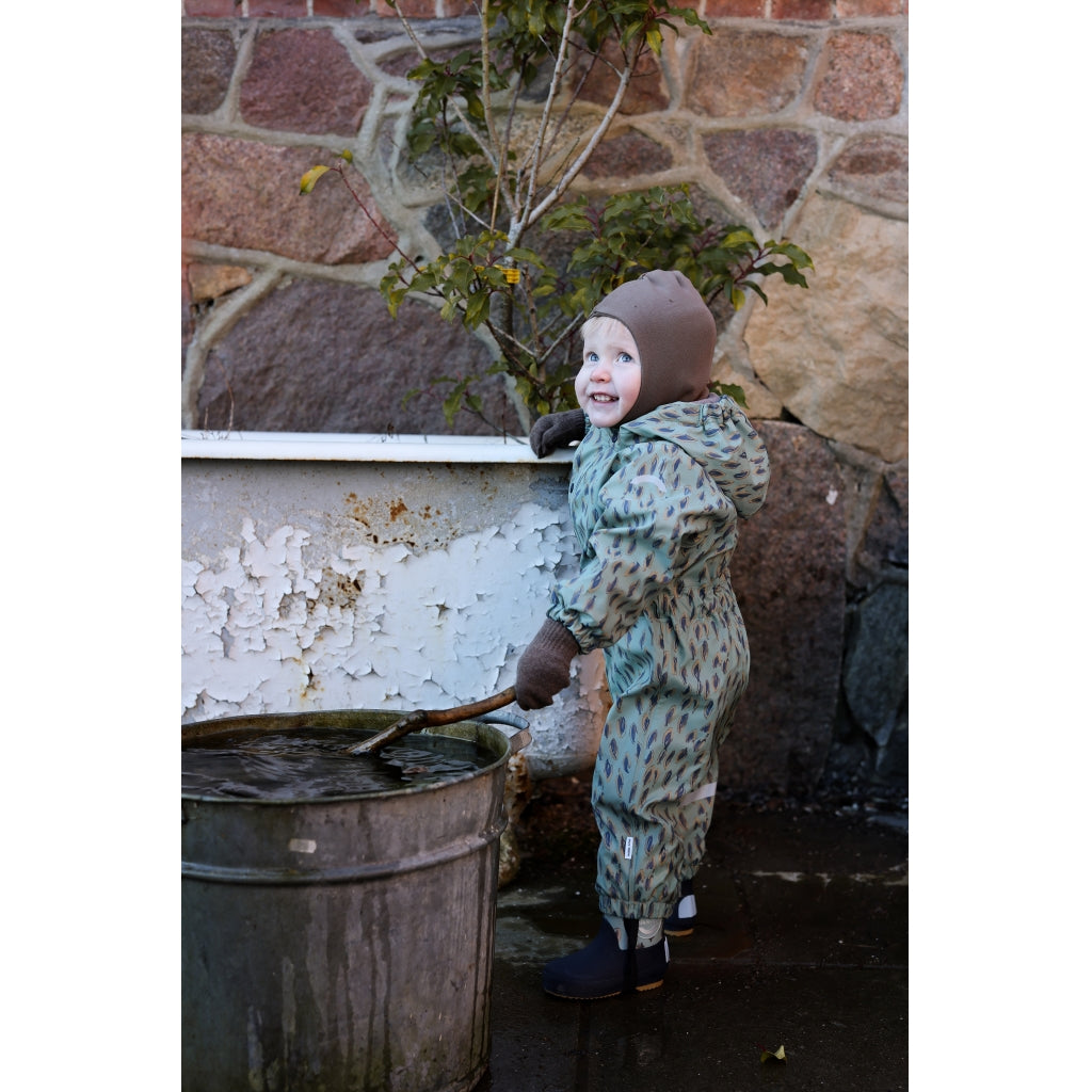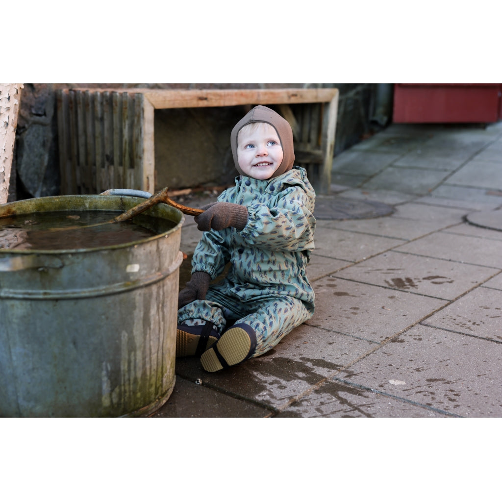 - Vindtæt og isolerende med en blød og plysset fleece foring i midten jakken og den øverste del af bukserne. Ærmerne og det resterende af buksebenene har en glat overflade for at undgå friktion og gøre det lettere at få barnet i regntøjet.