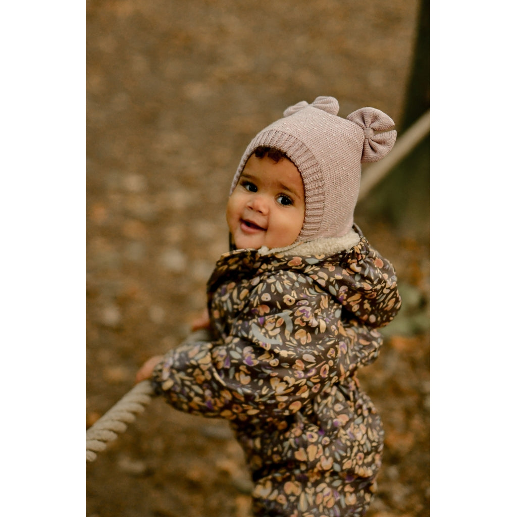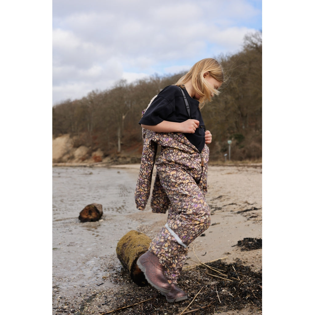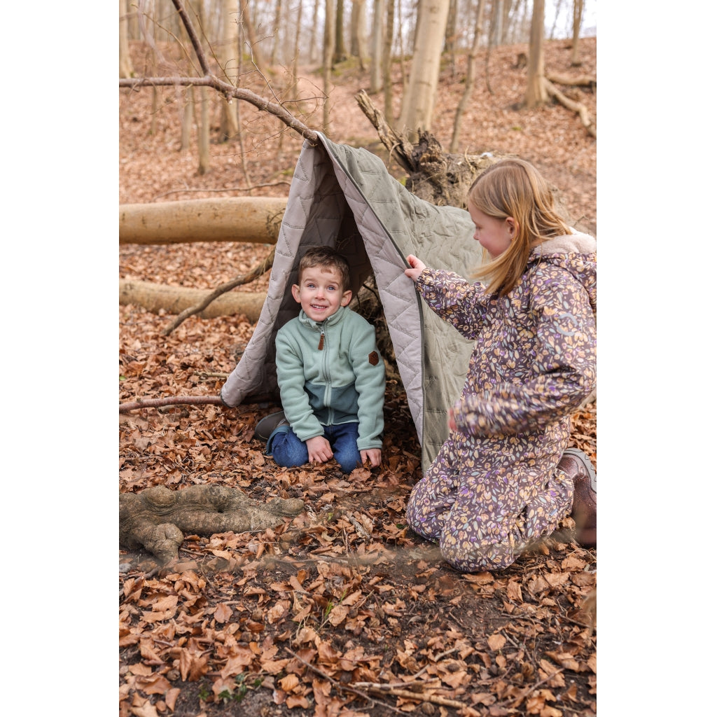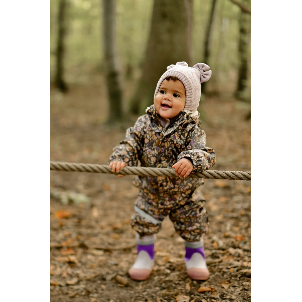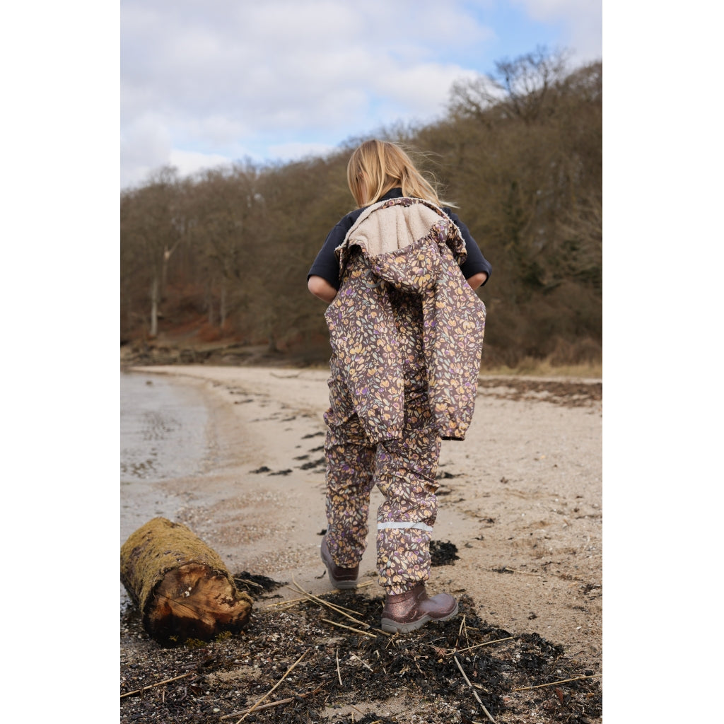 - Vindtæt og isolerende med en blød og plysset teddyforing i midten jakken og den øverste del af bukserne. Ærmerne og det resterende af buksebenene har en glat overflade for at undgå friktion og gøre det lettere at få barnet i regntøjet.