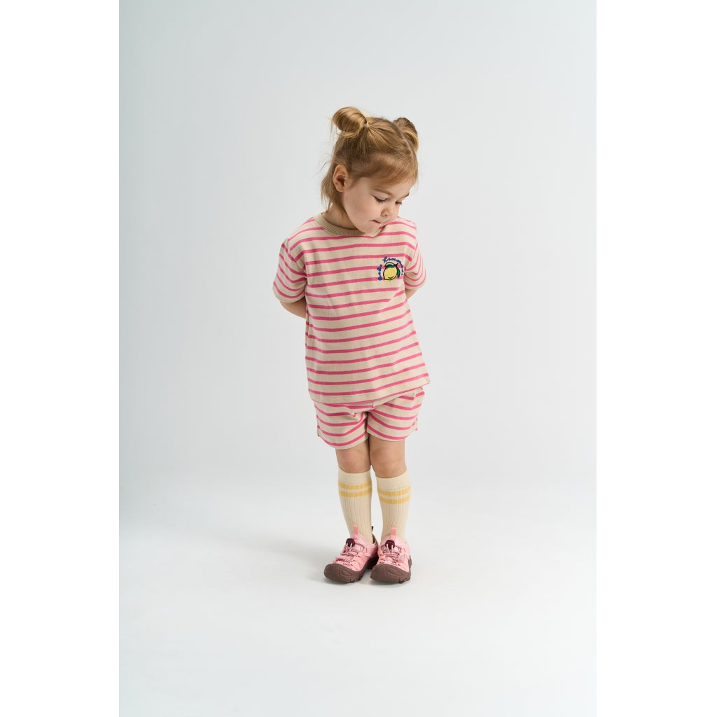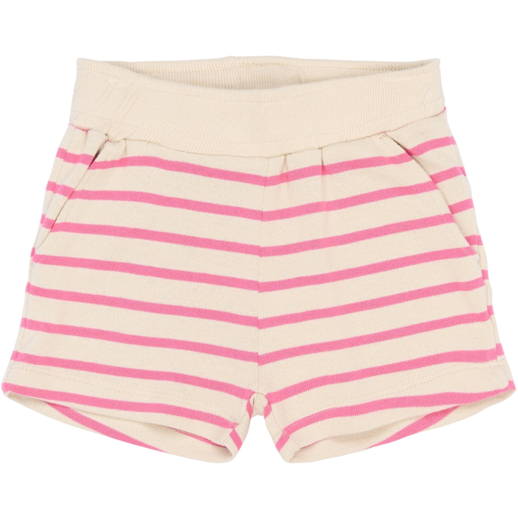 Disse shorts til toddler pige er lavet i 100% økologisk bomuld. Modellen har en bred, ribbet elastik i taljen og korte ben. Der er to skrå sidelommer og et stribet mønster med vandrette linjer. Pasformen er afslappet og nem at bruge i hverdagen. Velegnet til varme dage og kan styles med T-shirts, toppe eller lette sweatshirts.