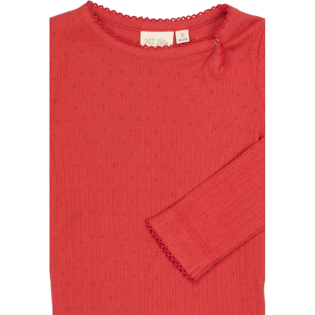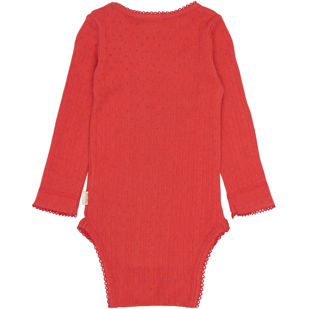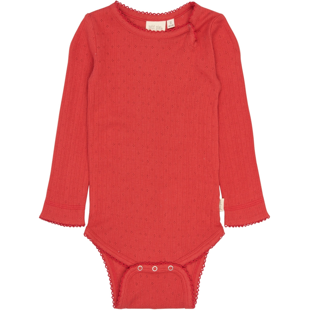 Denne langærmede body til piger er lavet af 100% økologisk bomuld og har en blød, behagelig fornemmelse mod huden. Den runde hals er afsluttet med en lille bølget kant, og den fine pointelle-struktur giver et let, luftigt udtryk. En trykknap ved skulderen gør det nemt at tage den af og på, og tre trykknapper i bunden gør bleskift enkelt. Kanter med picot-detalje ved ærmer og ben fuldender designet. Den lyse, neutrale farve er nem at kombinere og fungerer godt til lag-på-lag under bukser, nederdele eller heldragter. Egnet til hverdagsbrug året rundt.