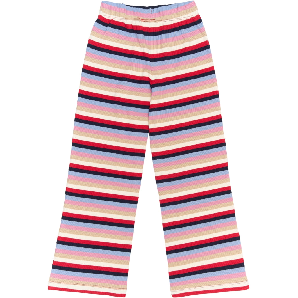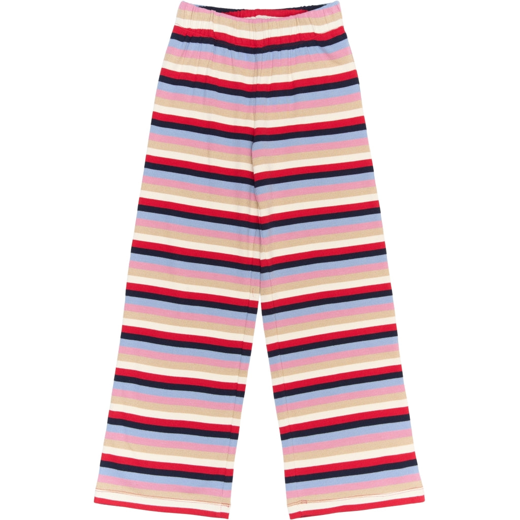 Skønne bukser med vandrette striber i varierende tykkelser og smukke farver. Disse pige-bukser fra THE NEW er ribstrikkede i et blødt materiale. Bløde og lette bukser med et stilfuldt og strækbart ribmønster. Den brede elastiske linning sørger for, at de sidder godt på plads, og de vide ben giver fri bevægelighed. De er særligt velegnede til hverdagsbrug, men kan også styles med en elegant top for et mere ekstraordinært sæt. Kombinér dem med den matchende TNRosie rib tee for et smukt stribet sæt.