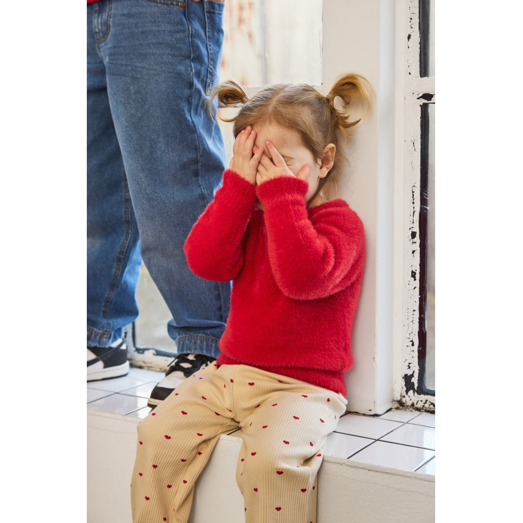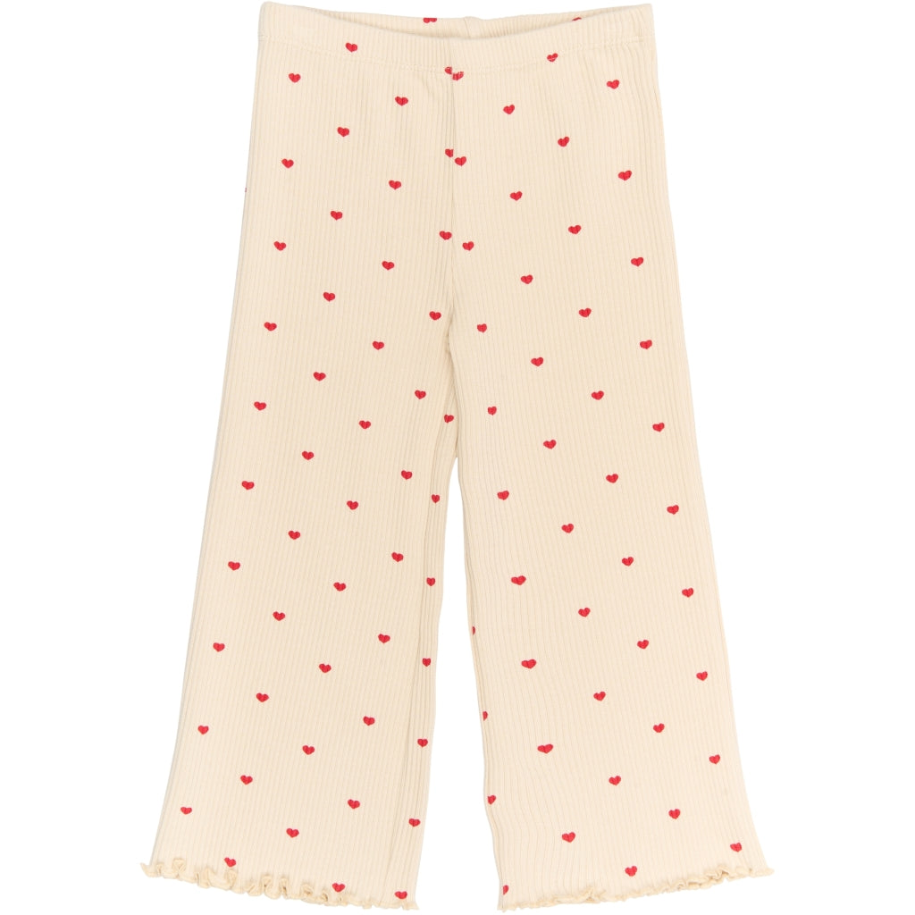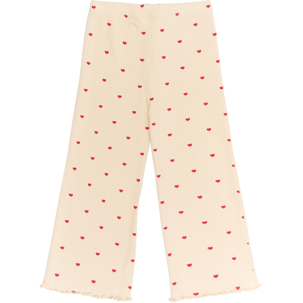 Disse wide-leg ribbukser fra THE NEW Siblings er både legende og komfortable – ideelle til hverdagsbrug med et stilfuldt twist. De har et charmerende all-over hjerteprint og feminine bølgede kanter ved anklerne, som tilføjer et sødt udtryk. Den bløde og strækbare kvalitet kombineret med en elastisk talje sikrer en behagelig pasform hele dagen. Kan matches med den tilhørende TNSTRhea Rib Tee for et komplet og koordineret look.