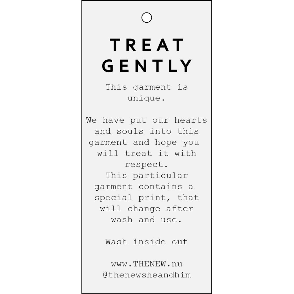Vaskeanvisning: Vask med lignende farver ved 30°C finvask. Tøjet kan krympe op til 5%. Må ikke bleges. Må ikke tørretumbles. Stryg indvendigt på lav temperatur (maks. 110 °C og uden damp). Må ikke renses kemisk.