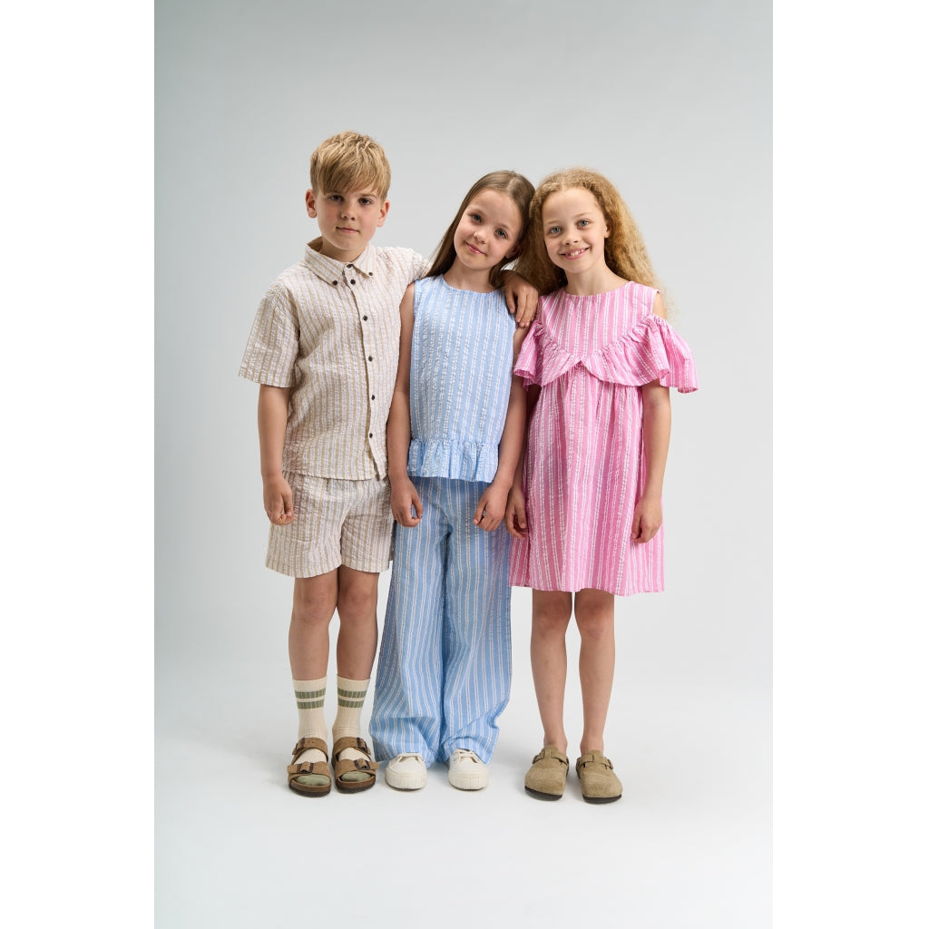 En let og sommerlig kortærmet skjorte til drenge, syet i 100% blød bomuld for maksimal komfort hele dagen. De lodrette, lyse striber giver et frisk og velklædt udtryk, der fungerer både til hverdag og festlige anledninger. Skjorten har klassisk krave, gennemgående knapper i kontrast og en let afrundet kant, som sikrer en pæn pasform – også når den bæres udenpå bukserne. Den luftige kvalitet gør den behagelig at have på, selv når temperaturen stiger. Style den med shorts, chinos eller åben over en T-shirt for et afslappet lag-på-lag look.